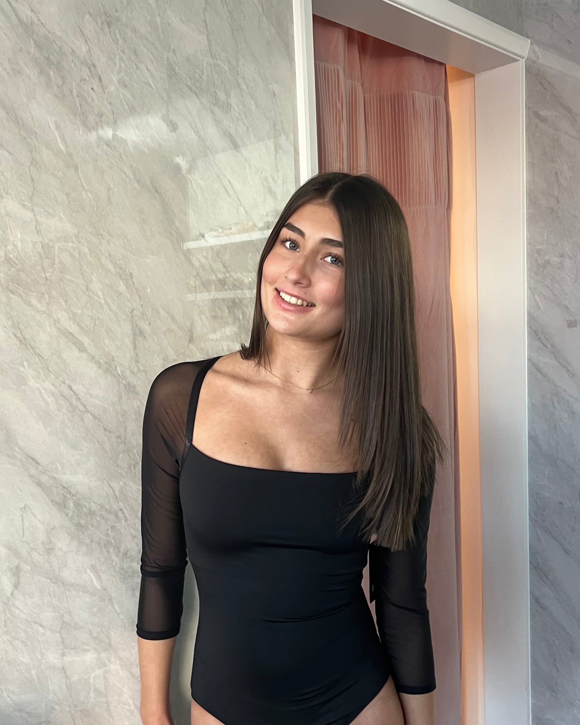 Soft, sheer ¾-length mesh sleeves