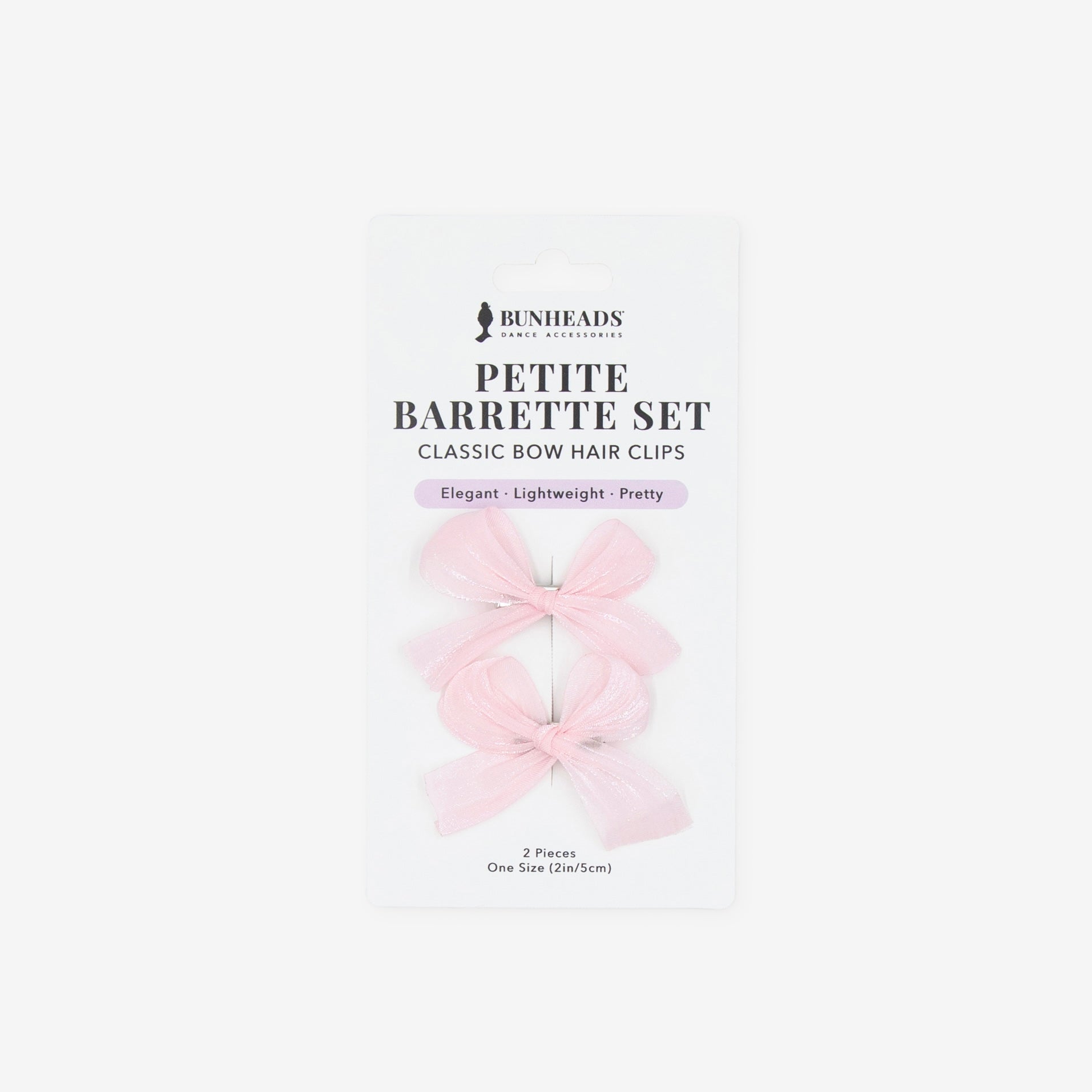 Add an elegant touch to any hairstyle with the Bunheads petite barrette set. Each soft, lightweight fabric bow is perfectly pre-tied on a miniature alligator clip for comfortable, all-day wear. Designed to complement all hairstyles and lengths, these stylish barrettes are the perfect finishing touch to any outfit. Contains 2 bow hair clips. BH1730